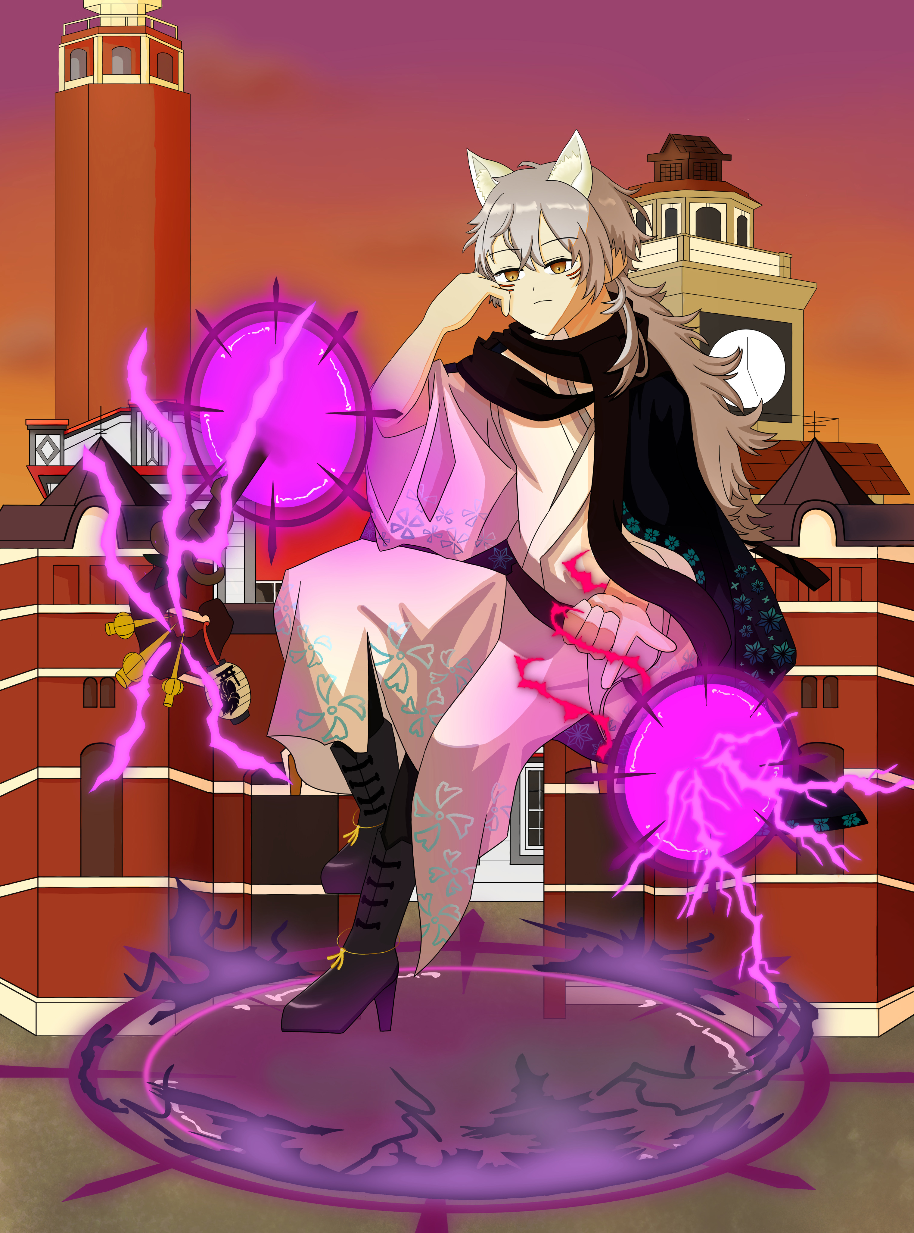 優秀だった陰陽師である女の子が魔物の影響で闇落ちし、人間に敵対しているイラストを描きました。